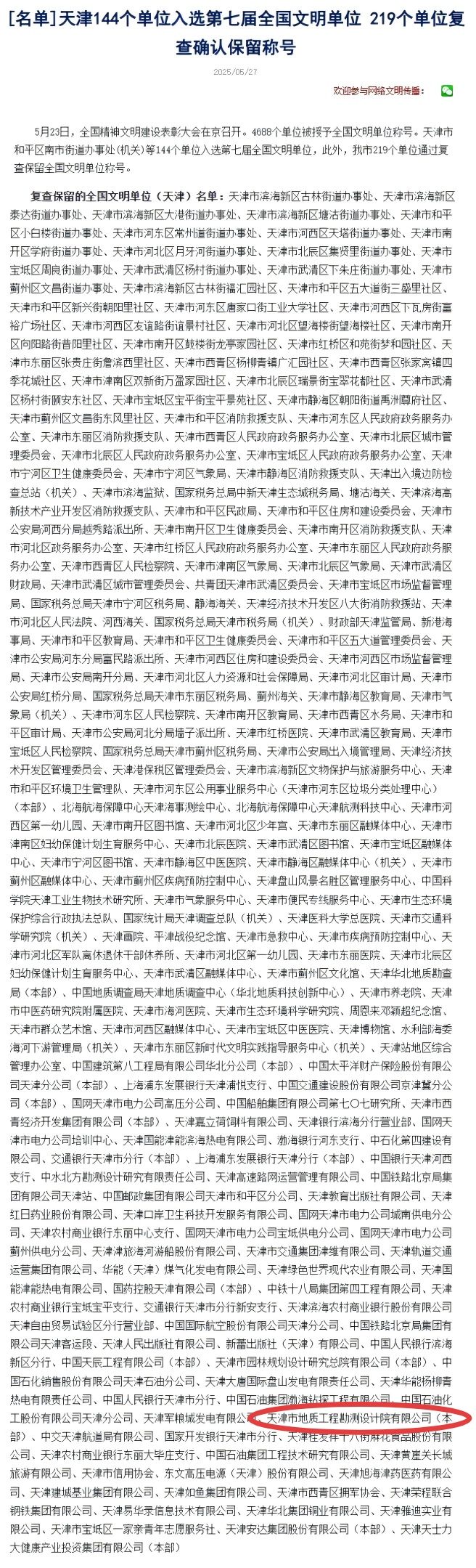 喜報!天津市地質(zhì)工程勘測設(shè)計院有限公司 順利通過全國文明單位復(fù)查確認